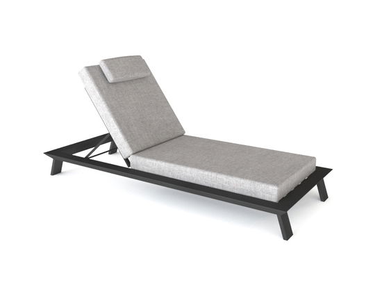 Ce bain de soleil est doté d’un cadre en aluminium anthracite, son dossier est réglable, ces coussins sont en tissu gris chiné. Il fait partie de notre collection Graphite. Il possède un petit coussin de tête qui parfait pour compléter.