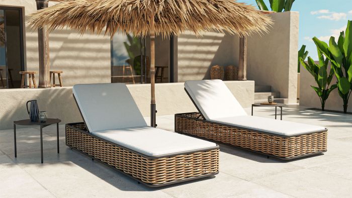 Nous le proposons en taille S (un bain de soleil et une table d'appoint) et taille L (deux bains de soleil et deux tables d'appoint).