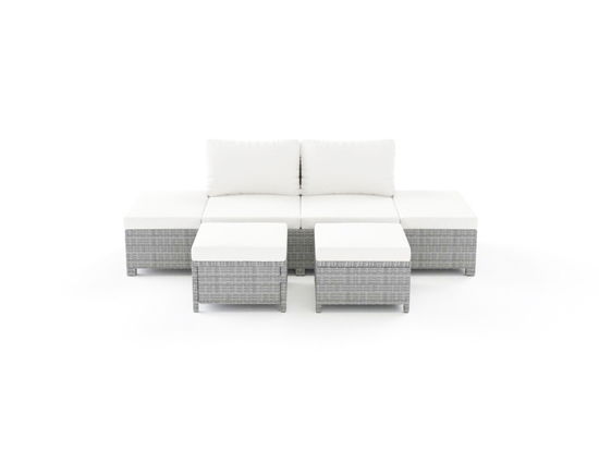 Les meubles d'extérieur confortables possèdent un cadre stable en aluminium ainsi qu'un revêtement en résine tressée gris City. Les coussins d'assise et de dossier sont de couleur blanche. L'ensemble est modulable : la chaise longue ou le canapé 3 places peuvent être utilisés comme canapé 2 places avec des surfaces de rangement latérales. Les poufs ne sont pas rembourrés et peuvent également servir de table basse. Un pouf supplémentaire est livré avec un plateau en verre et peut être utilisé comme plateau de table si nécessaire.