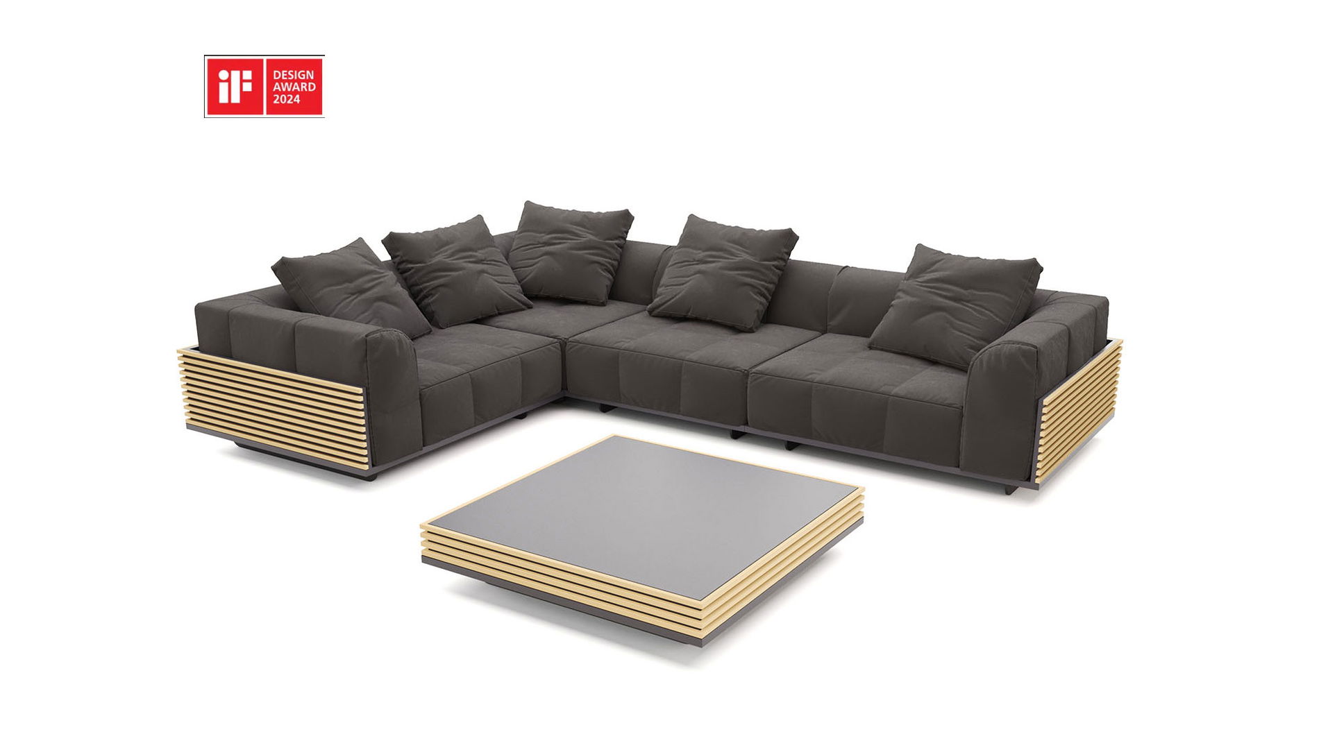 Chaque détail, des coussins d'assise exceptionnellement épais et confortables à la table basse avec sa plaque de verre de 5 mm d'épaisseur, incarne un mélange de fonctionnalité et de luxe épuré. L'agencement ne met pas l'accent sur la quantité, mais sur la qualité, qui s'intègre parfaitement dans le design et crée une ambiance de légèreté.